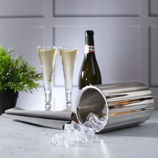 Crafted with meticulous attention to detail, this wine cooler exudes an aura of opulence with its sleek Art Deco-inspired silhouette. Its shimmering metallic finish adds a touch of glamour to any setting, be it a chic soiree or an intimate dinner.