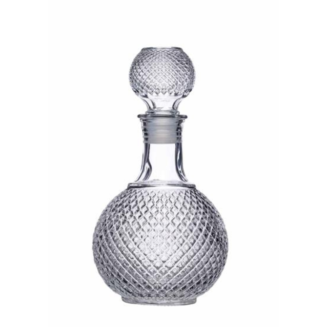 This rounded decanter bottle is crafted from crystal clear glass with traditional ornate detailing, giving it a stately look that`s worthy of a spot in any home drinks cabinet. It`s ideal for storing and pouring your prized alcoholic beverages, whether it’s a smoky Scotch whisky, an oaky Amontillado sherry or a sweet sloe gin.
