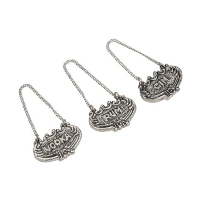 • THIS GIFT SET INCLUDES... antique-style rum (copper), vodka (brass) and gin (silver) decanter tags