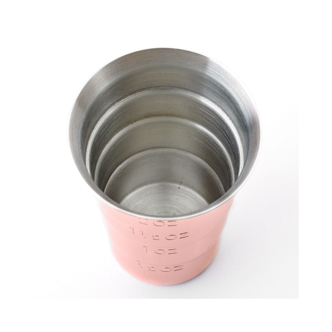 A single piece body offers that amazing durability combined with accurate measurement. This Copper Stepped Jigger from Barfly is made from heavy-duty stainless steel an features external measurement markings on both sides which starting from ½ oz or 15ml increments up to 2 oz/60 ml. This Jigger also has a flared top edge for pouring and strength. The non-handled version nests for compact storage.