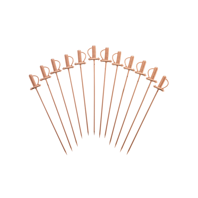 An elegant way to garnish drinks to elevate your presentation the Barfly Copper Sword Cocktail Picks is made from 18-8 Stainless steel which it is made for durability and corrosion resistance, it`s sharp point quickly and cleanly pierces garnishes and is designed so it will not fall into martini glasses.