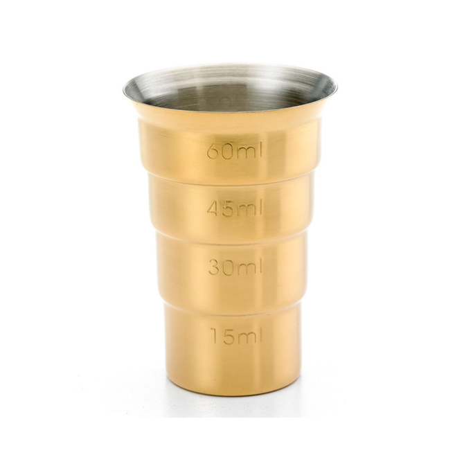 A single piece body offers that amazing durability combined with accurate measurement. This Gold Stepped Jigger from Barfly is made from heavy-duty stainless steel an features external measurement markings on both sides which starting from ½ oz or 15ml increments up to 2 oz/60 ml. This Jigger also has a flared top edge for pouring and strength. The non-handled version nests for compact storage.