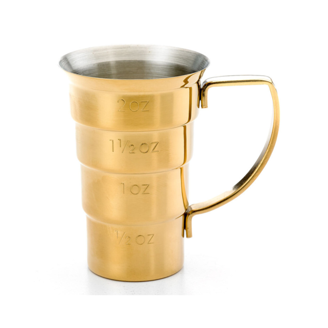 A single piece body offers that amazing durability combined with accurate measurement. This Gold Stepped Jigger from Barfly is made from heavy-duty stainless steel an features external measurement markings on both sides which starting from ½ oz or 15ml increments up to 2 oz/60 ml. This Jigger also has a flared top edge for pouring and strength.