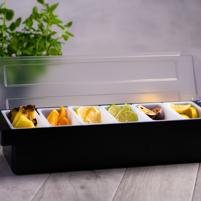 Store fruit and other garnishes in an easily accessible and efficient way with this Black Plastic Condiment holder. Durable and hardwearing, each compartment can hold up to a pint.