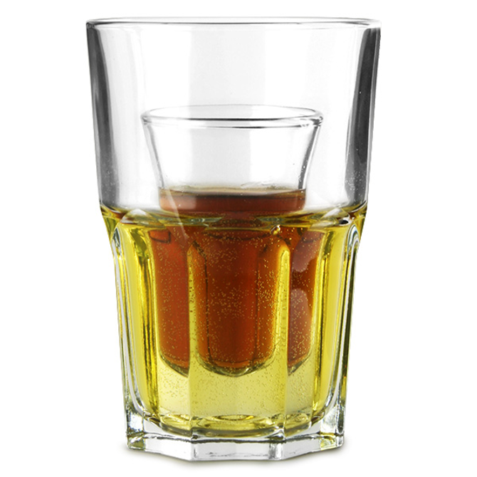 • Simply drop the full shot glass in the 1/3rd full tumbler and drink