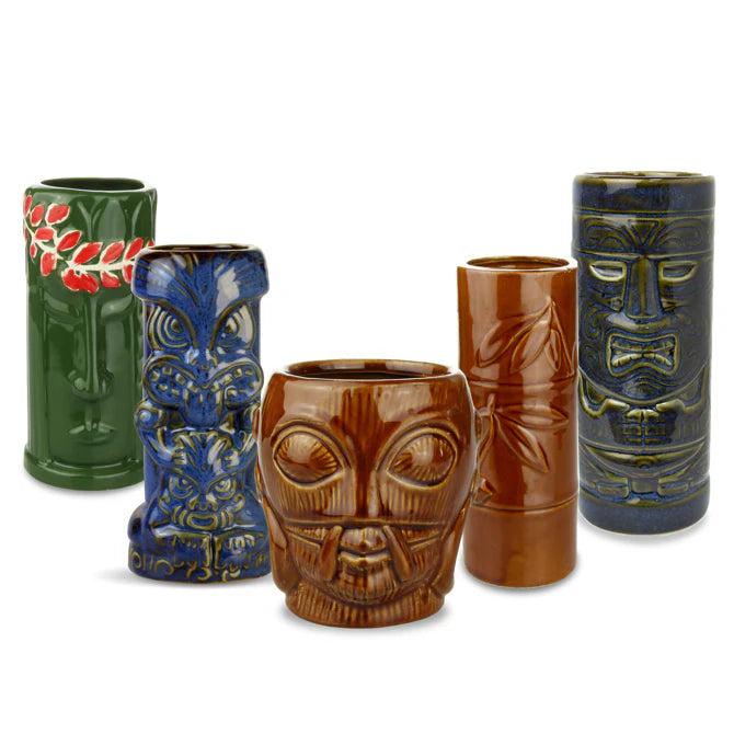 Made up of 5 retro inspired tropical tiki mugs, this Ceramic Tropical Tiki Party Pack is essential for any Hawaiian Luau parties. Perfect for serving up classic tiki cocktails like a Mai Tai or even a fruity strawberry daiquiri, these handcrafted ceramic mugs feature five classic designs this party pack will make sure everyone can join in on the luau fun.