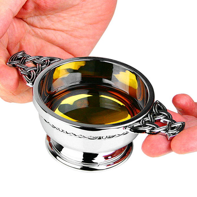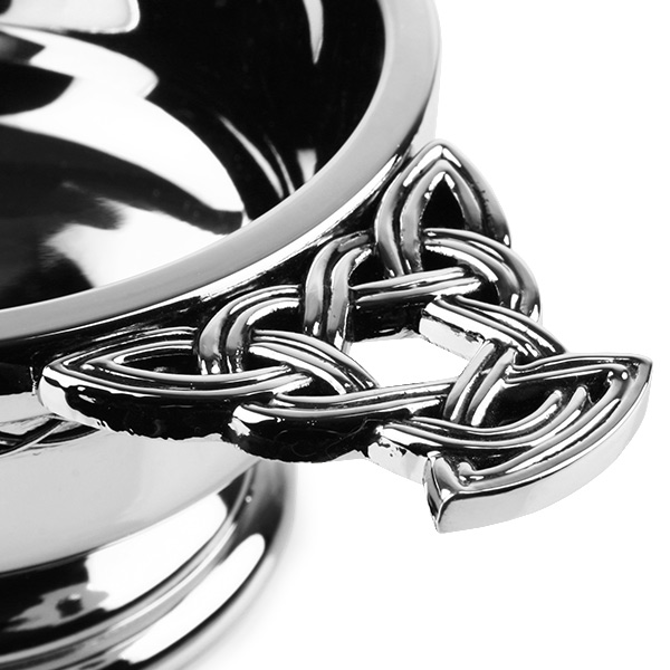 Finished with a traditional style Celtic band, the Chrome Plated Quaich Bowl makes an ideal gift piece. Made from pewter with a chrome plated finish, this drinking cup is traditionally used in Scotland to offer guests a 'cup of welcome' when they arrive and depart.