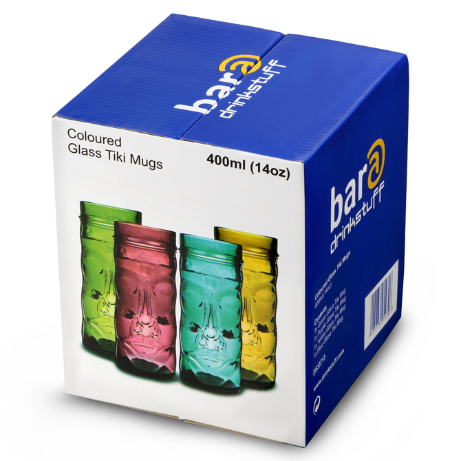 The Coloured Glass Tiki Mugs feature a double sided embossed tiki head design. Perfect for creating an exotic feel to every fruity cocktail you serve.