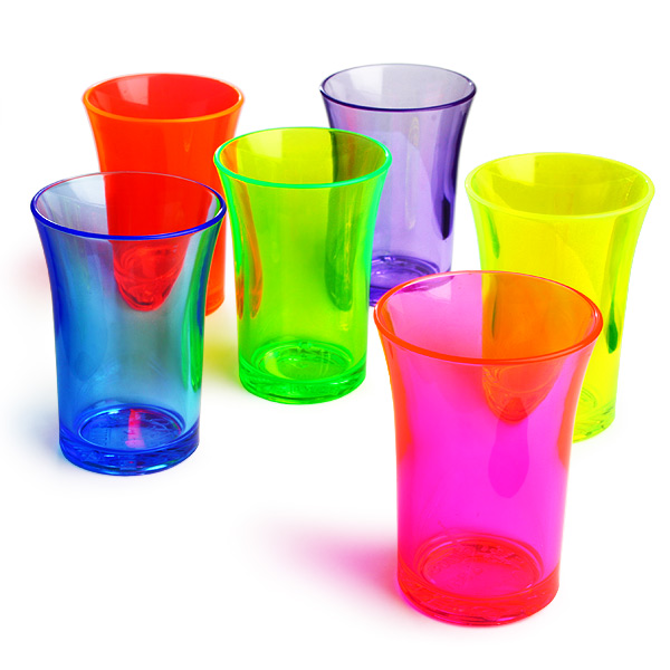 This pack of 6 colourful translucent shot tumblers ensures a bold and exciting display, no matter what drink you're serving! What's more, these plastic shots glow under UV light, meaning they will mesmerise anyone, whether they've already had a shot or not! With a mixture of Red, Orange, Yellow, Green, Blue and Purple, you are guaranteed a colourful light show!