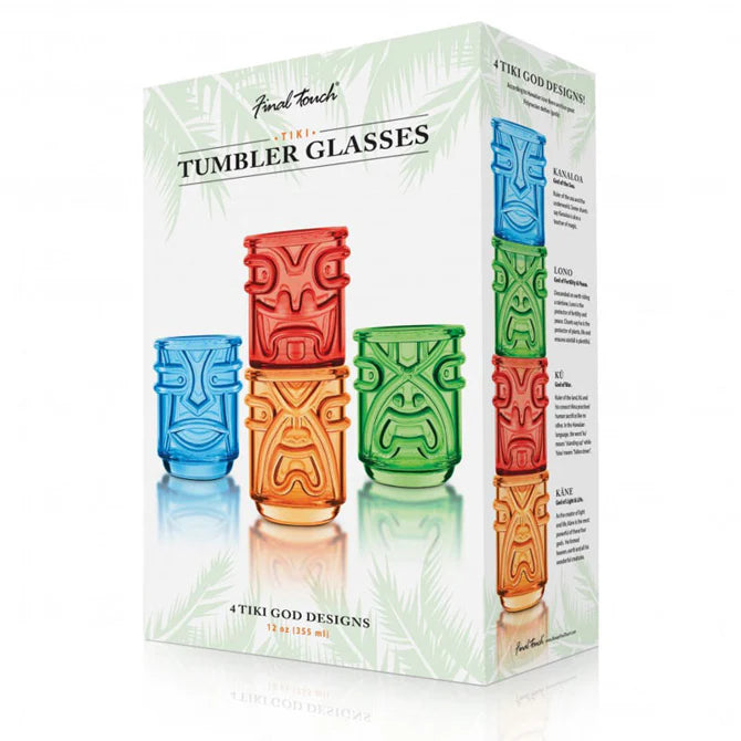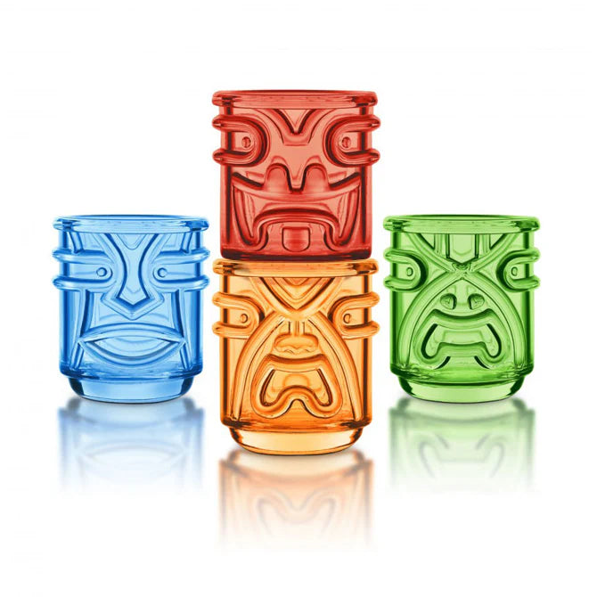 These Coloured Tiki Tumblers feature a stackable design that resembles a totem pole when stacked, providing creative drink service. Showcasing four different designs and colours they depict the faces of Hawaiian Gods Ku, Kanaloa, Lono and Kane making them perfectly suited to Hawaiian, Tiki and Luau themed parties or events.
