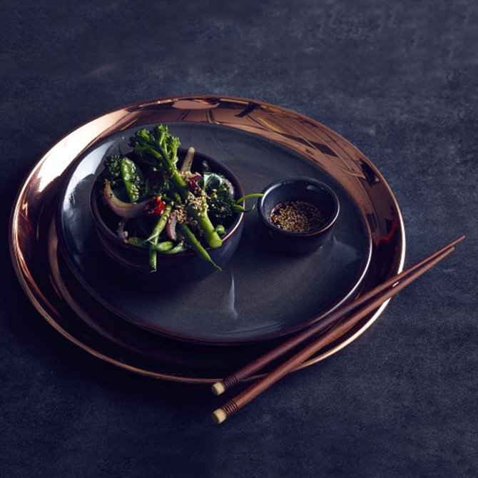 Add a contemporary, on trend aesthetic to your bar service and food presentation with this Genware Round Copper Tray.