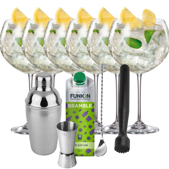 We have created a bundle that includes essential accessories needed to create different flavoured gin cocktails in the comfort of your home. This bundle includes six Enebro Gin Glasses, a cocktail shaker with strainer, a twisted mixed spoon, a plastic muddler, a jigger measure and a Funkin bramble mixer.
