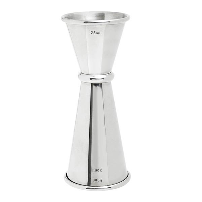 With an improved design, this Mezcalr Banded Jigger from Beaumont is perfect for use when making cocktails. With a 25ml and 50ml end, this jigger also features a 35ml internal line.