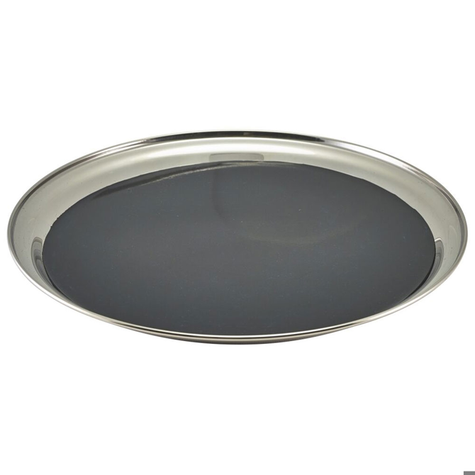 Prevent spilling and breaking your guests food and drinks with the Non Slip Stainless Steel Round Tray from Genware. Fitted with a non-slip surface which grips on to the plate and glass. Finished of with a rolled edge this tray is perfect for presenting champagne and shot glasses.