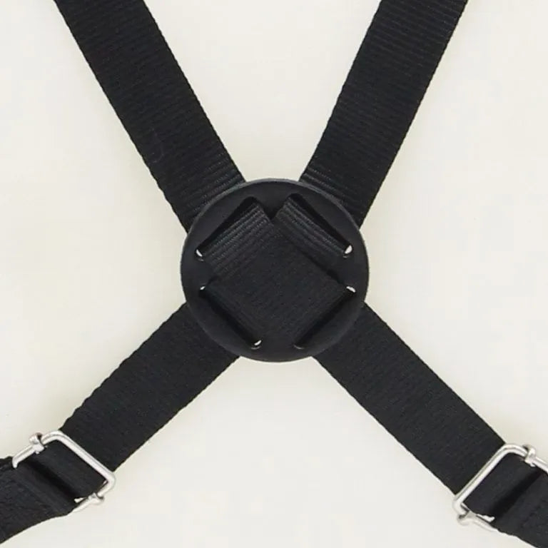 The Peter Jones KlickFast Chest Harness (4-Point) with Metal Clips uses tough polyester straps to secure the docking station on the body. These straps are tightly woven and suitable for use in outdoor and demanding environments. The staps themselves can be lengthened and shortened near the clips with additional size adjustment possible where all four meet on the back of the harness.