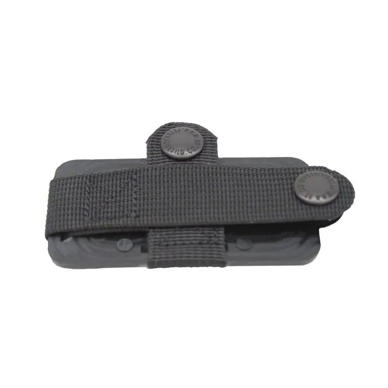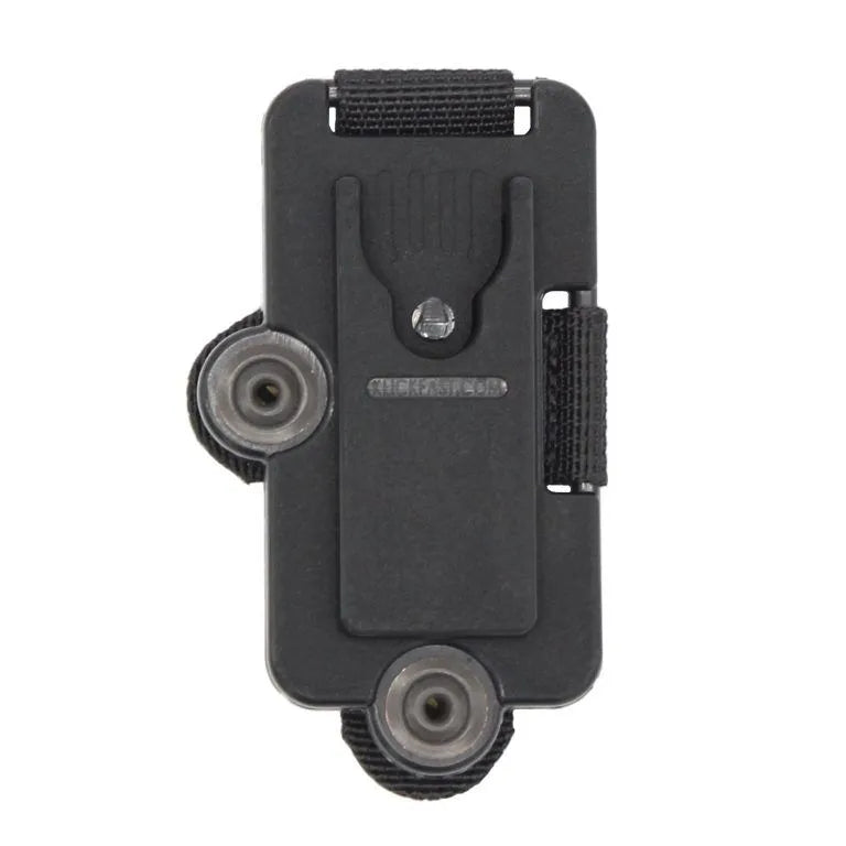 The Peter Jones KlickFast Molle Dock has two metal snap buttons that secure the device around PALS Straps. They are tightly moulded and require a decent amount of pressure to be pulled open.