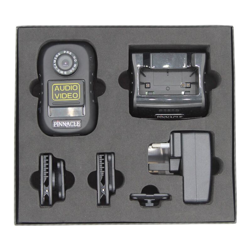 The Pinnacle PR6 LITE Body Camera includes one Pinnacle Body Camera, a single port solo charging dock, USB cable, mains chargers, 2 KlickFast attachments (fixed and rotatable), a rotatable clip, a fix clip and a small screwdriver for installing the attachments.