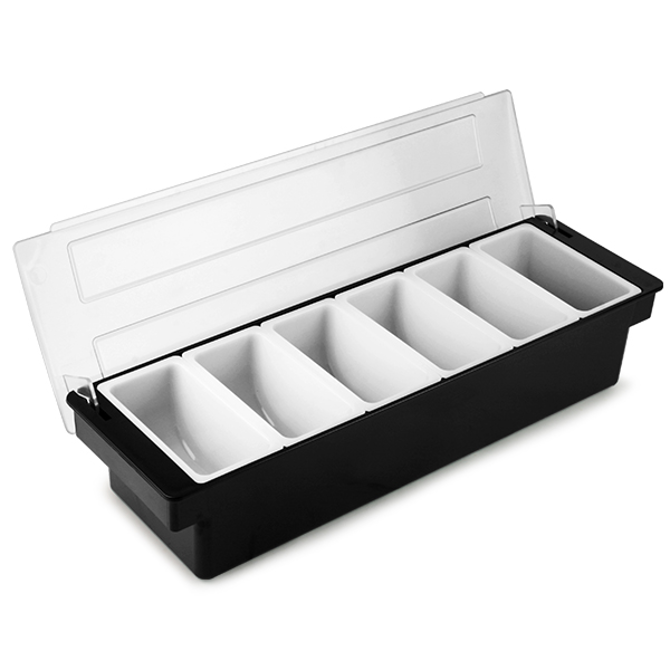 The Condiment Dispenser 5 Compartment adds a professional look to any bar and helps keep it looking clean and tidy. Each acrylic pot is removable and is ideal for filling with cocktail condiments such as citrus slices, cherries, olives and pickles.