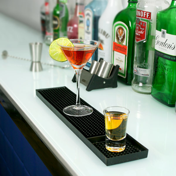 Featuring 10mm rubber prongs to collect any spilt liquids, it also has a shallow end for single glasses. This durable Rubber Bar Mat is easily washable, making it convenient for modern home bars.
