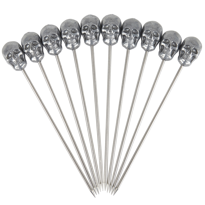 Serve cocktails with a dark twist using these Skull Cocktail Picks from Beaumont. Perfect for Halloween and Day of the dead parties, these cocktail picks feature a silver finish. Made from a reusable stainless steel, these cocktail picks are the perfect alternative to plastic cocktail picks.