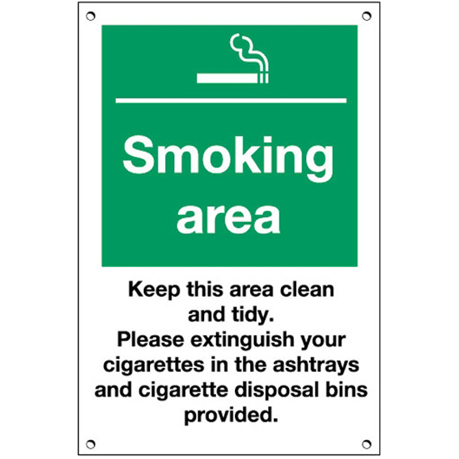 Designated smoking area signs are here to ensure that smokers know where they are allowed to go. Designed for placement in smoking areas the sign is made from 3mm rigid plastic and is pre-drilled for easy fixing. Ideal for use in a whole manner of different establishments they are a great buy for any business.