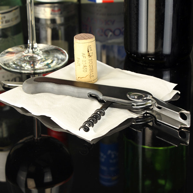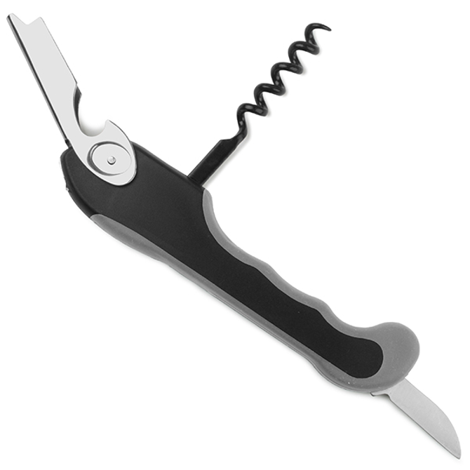The soft grip gives this a comfortable hold, while the flip out tools make this light and compact when not in use. Combining a serrated blade for removing foil from wine bottles and a corkscrew, it makes opening bottles smooth and quick. Also included is a bottle opener for crown capped bottles, making this the ideal waiter and bartender tool.