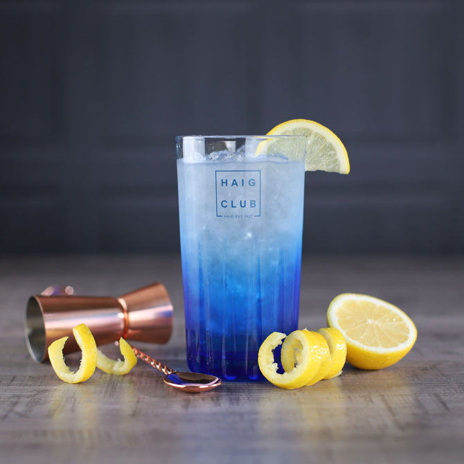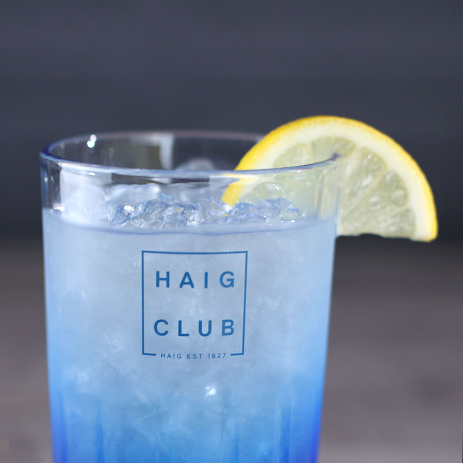 This glass features the traditional "Haig Club" Logo, including a clear to Blue tint reminiscent of the Haig club whiskey bottle, allowing your chosen beverage to stand out among standard glasses for the presentation of a bold drink.