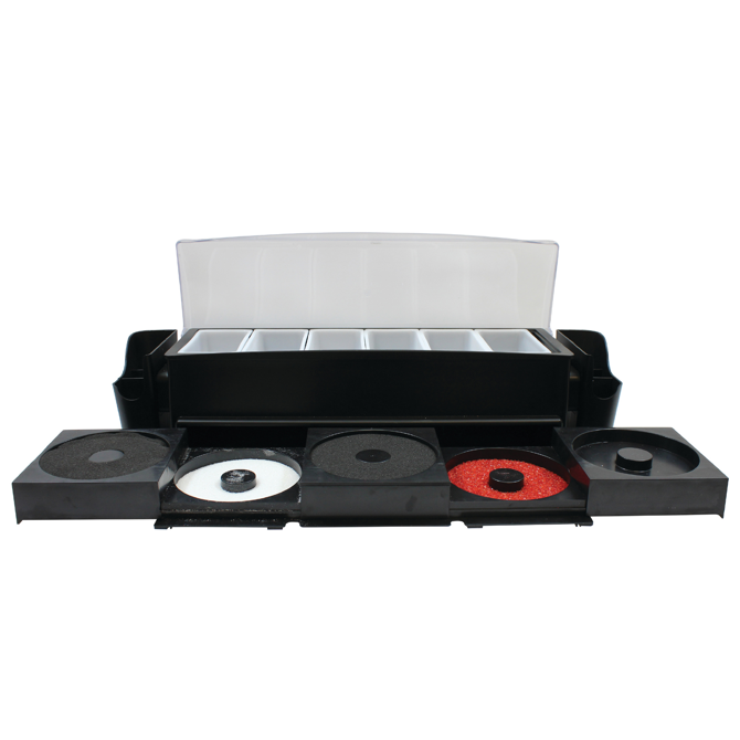 This Ultimate Garnish Station is a bartenders best friend! With an all in one design, this cocktail garnish station is the perfect solution for bars, pubs or home bars. Featuring five garnish compartments, two side caddies and five integrated rimming trays, this station is an essential bar accessory.