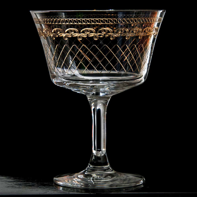 These Cocktail Glasses from Urban Bar feature a gold rim and vintage inspired etched pattern for truly unique drink presentation.