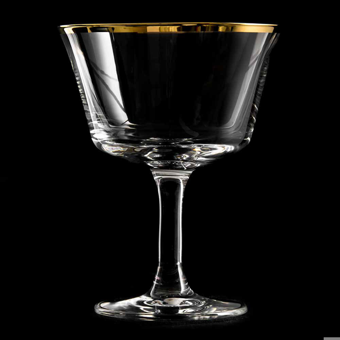 Featuring a gold rim and flat based bowl with flared sides, these Retro Gold Rim Fizz Cocktail Glasses offer a vintage inspired aesthetic.