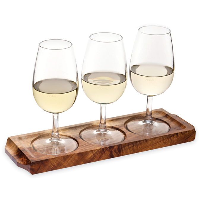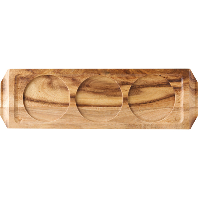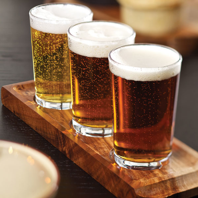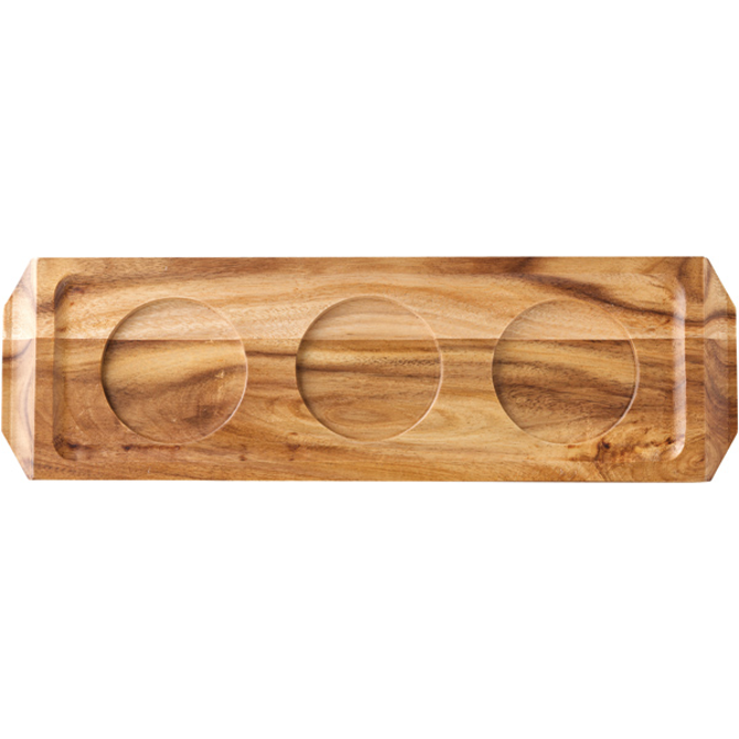 Meet the demand for tasting menus with the Utopia Acacia Wood Wine/Beer Flight. This elegantly shaped natural wood board is double sided to allow for versatility when serving in your restaurant or bar. One side is specially designed for wine glasses, with three wells for sampling different reds or whites, while the reverse side has three wells for 1/3 of a pint glasses so the customer can taste different beers while still enjoying a pint.