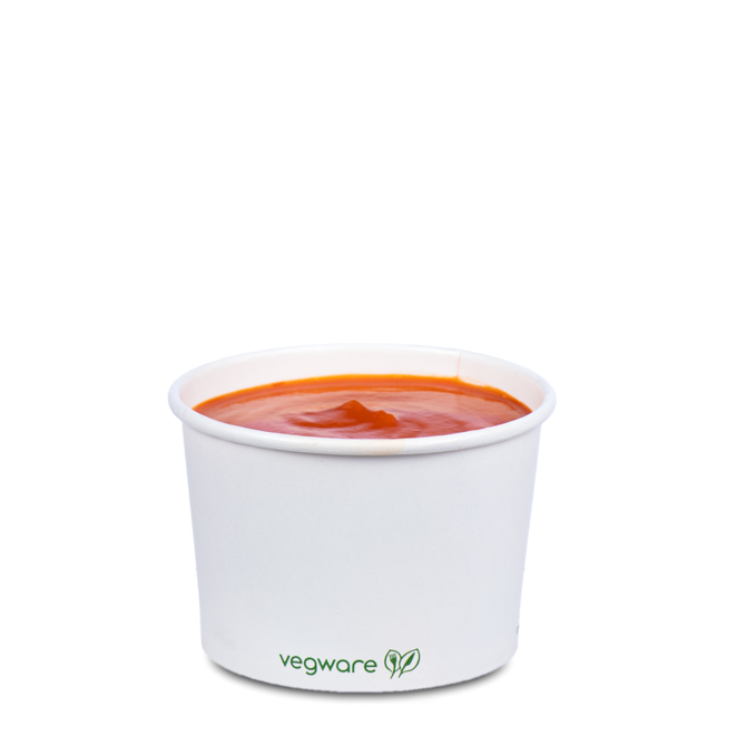 Versatile, leak-proof, sturdy round tub. Fits Vegware''s 90-Series lids. For hot soups, pasta, noodles, porridge or one-pot meals, or for cold salads or ice cream. Sustainable board with a plant-based PLA lining. Crisp white, with Vegware messaging in green. Award-winning quality by Vegware, made from plants. Commercially compostable where accepted.