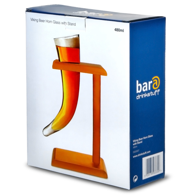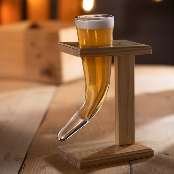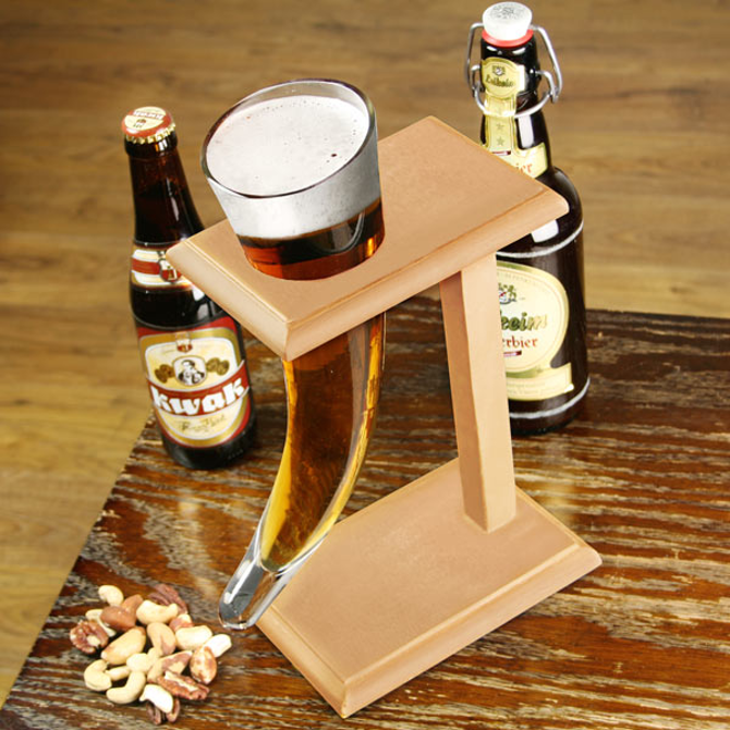 Plunder your pint with the Viking Beer Horn Glass with Stand! Ideal for bringing medieval flavour to your beer, this drinking horn offers a truly novel way of serving ale, cider or lager. A stylish natural birch stand creates the perfect resting home for your unique drinking vessel.