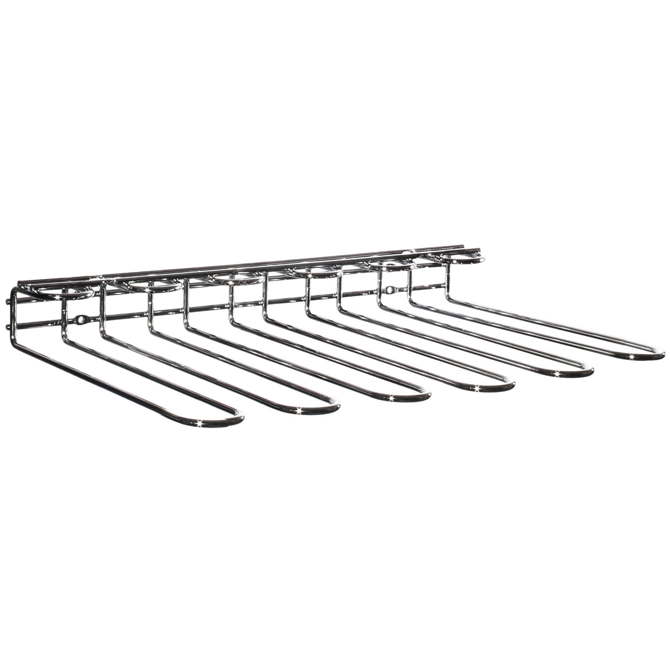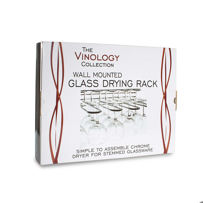 The Vinology Wall Mounted Glass Rack provides safe storage for your stemware. Fixable inside your cupboards or wall mounted this chrome steel hanging rack holds 15 large wine glasses or 25 flutes. No more balancing stemware on the draining board!
