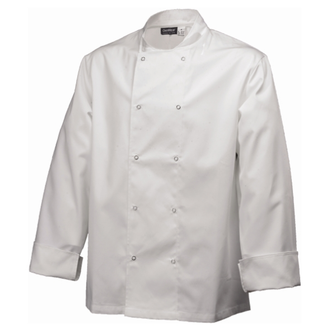 These long sleeve jackets by Genware are essential for any busy commercial kitchen. Comfortable and durable polycotton fabric, perfect for everyday use and repetitive commercial laundering.