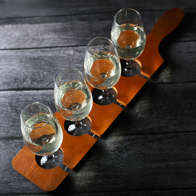 Holding up to 4 stemmed taster glasses at once, this drinks flight is perfect for serving tasters of your establishments house wines, craft beers or even short cocktails.